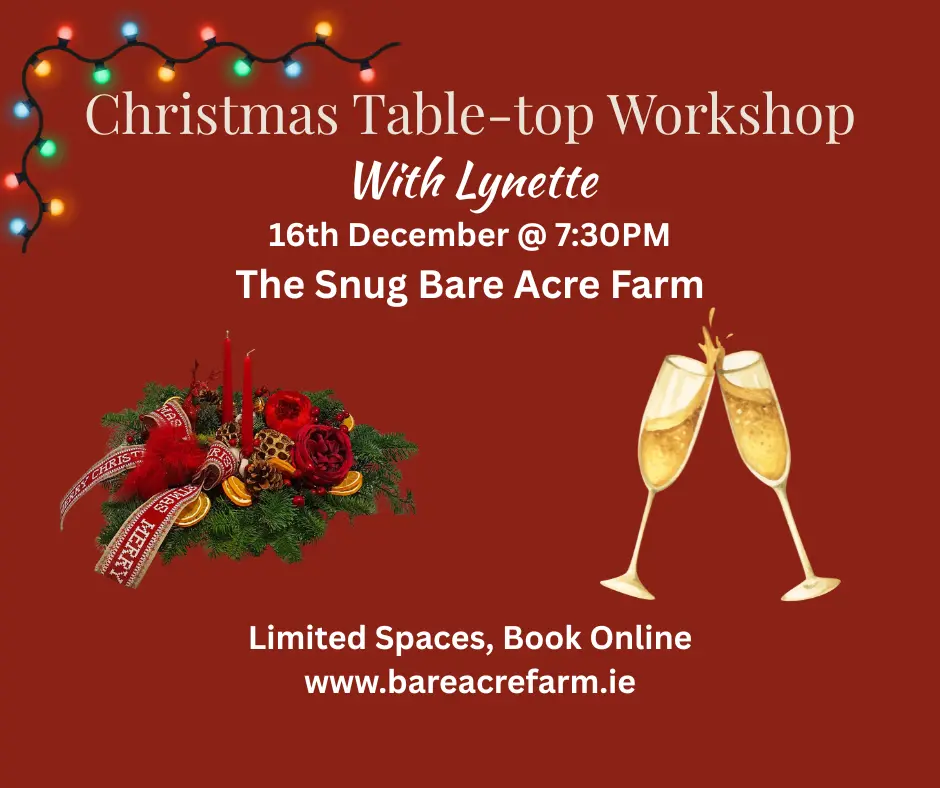 Get into the Christmas Spirit and impress your family & friends with your very own fabulous Christmas table arrangement. You will be guided step by step by Lynette. Everything will be provided for you including a Festive glass of bubbly and craic agus ceol guaranteed. All you need to bring is some festive spirit and a a little creativity.
